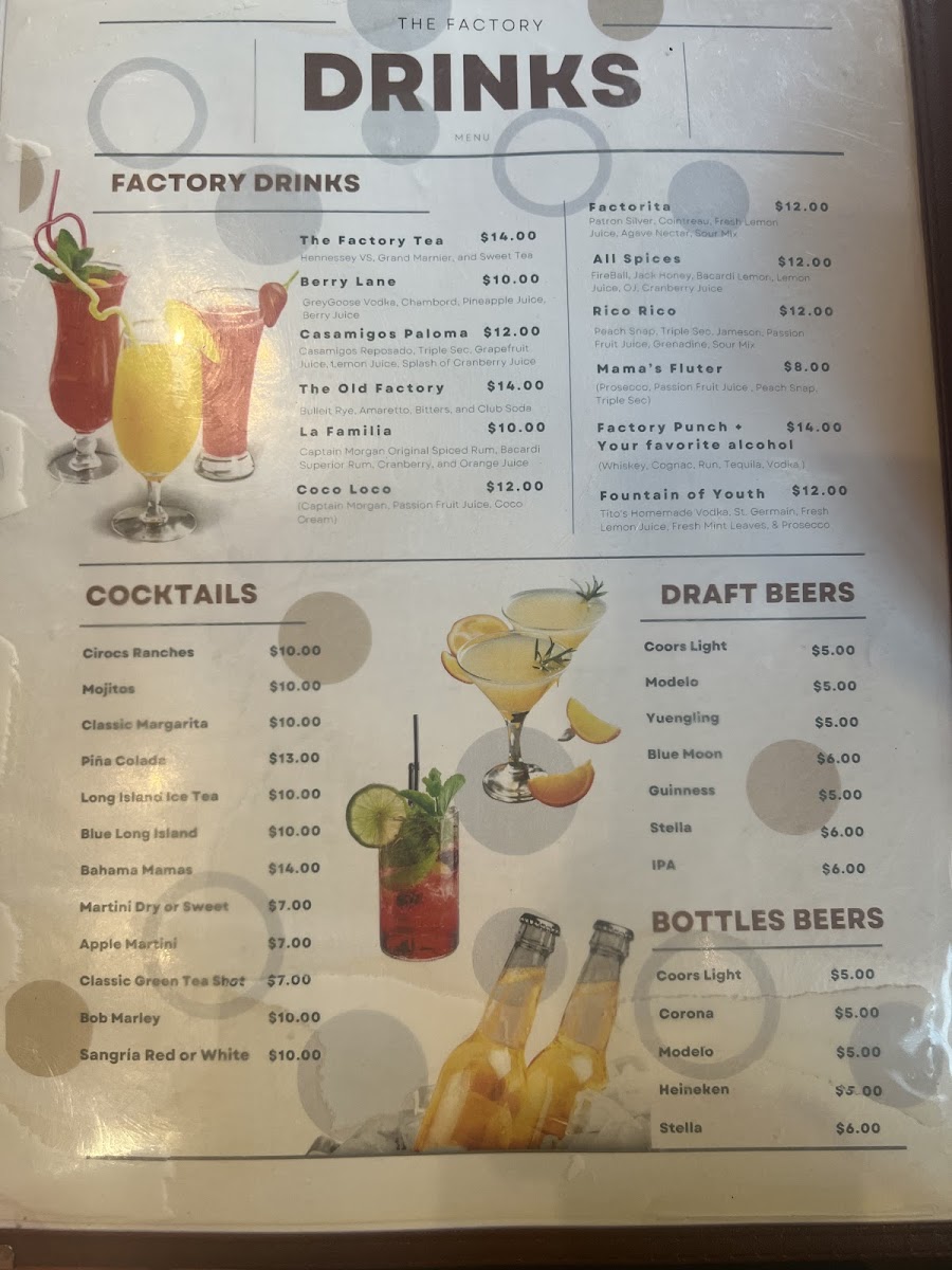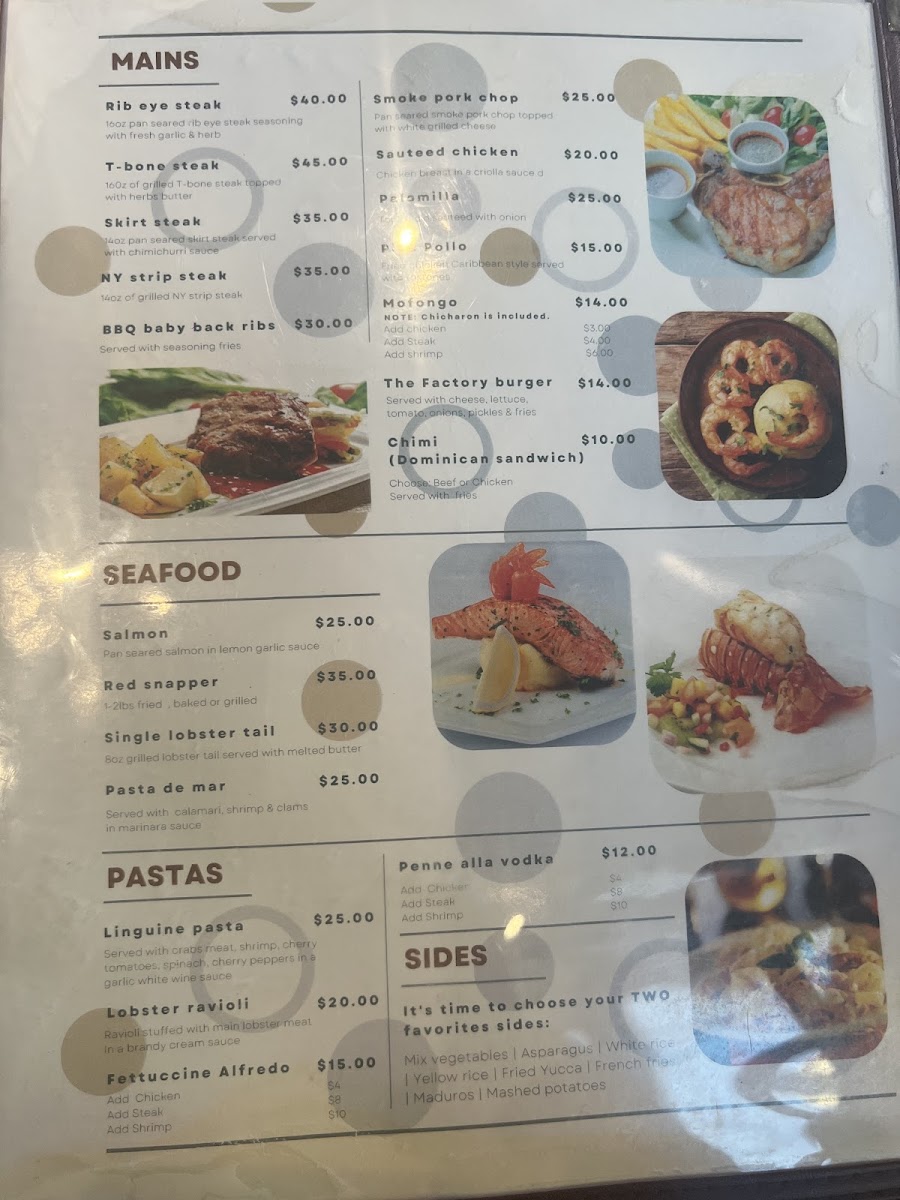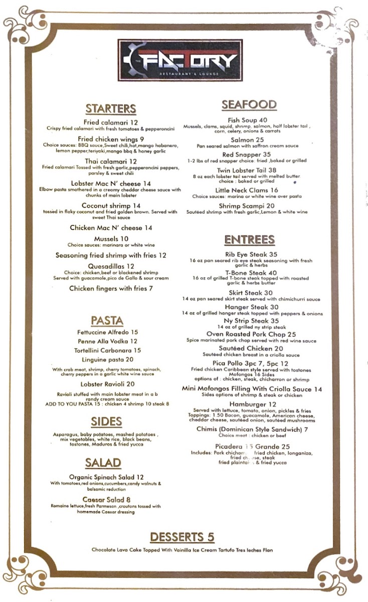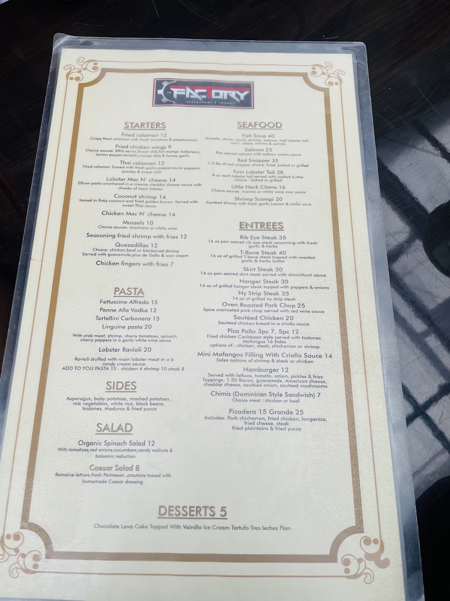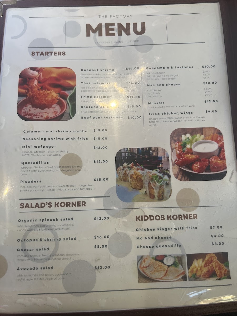 The Factory offers a thoughtfully curated menu that blends American favorites with Dominican flavors, creating a relaxed dining experience that suits both casual meals and lively gatherings. The selection features comforting dishes and approachable drinks designed to pair well with the restaurant’s inviting atmosphere.
